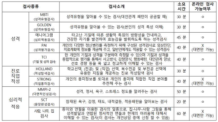 ※ 대면으로만 가능한 PAI 와 STRONG 심리검사를 원하실 경우, 센터에 방문하여 신청해주시기 바랍니다.